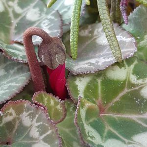 2年目のガーデンシクラメンの中で、蕾が中々上がって来なかった株。 ようやく赤いお花が咲き始めました❣️💚 待ってたよ💕