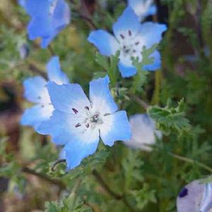 おはようございます✨ 昨年のネモフィラなんですが突然変異で花が星形で咲いていました😲 普通は花びらは丸型です✨ 種をとろうとしたんですが種がみつからずとれませんでした(ToT) ネモフィラプラチナスカイとかけあわせたらどんなお花が咲いたのでしょうか… 今となっては見ることができなくなった幻のネモフィラです🎵