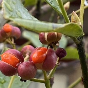 柾木🌳 マサキ 散歩道植栽 実が弾けてます〜♡♡ 大きな実は12㍉size。小さなのは5、6㍉大です。 橙色の種がかわいい💕(^^)🧡
