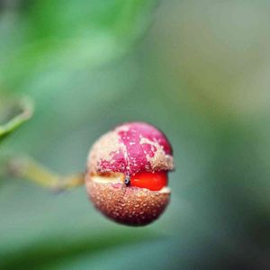 おはようございます😊 雨の朝です☂️ 木の実は何でしょうか❓ 実が割れて、中から赤いタネが顔を出してます😃