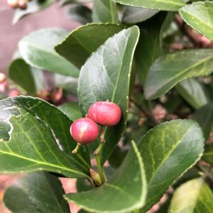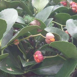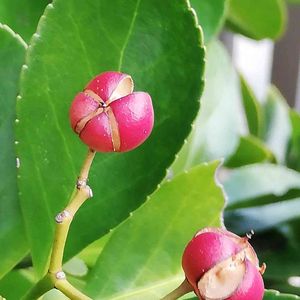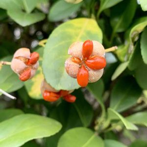 マサキの種が可愛い 日本の昔から庭木に取り入れて来た木です。🍃 🌱ニシキギ科、ニシキギ属、常緑低木。 他、オオマサキ、ナガバマサキ、コバマサキ、ホウジュマサキ、ヤクシマサキ と呼ばれてるそう、それだけ各地で庭木に用いられ愛された日本の木なのかもしれません 我家の垣根のマサキは、生垣として、たびたび私が刈り込みをせねばならないので、実を付けません、仕方ない😆