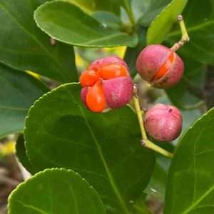 遊歩道にて 柾木、正木(マサキ) 果実から種が飛び出そうとしています。 花は6~7月頃に咲くそうです。あまり認識していなかったので、楽しみです。
