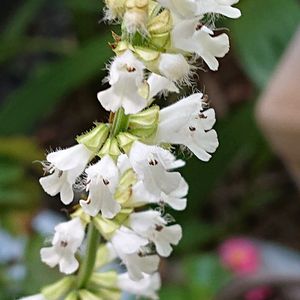 今日2枚目は初めましての 白花アキノタムラソウ🌿🤍 シソ科アキギリ属🌿 本州〜琉球の山野の疎林や 道端に普通に見られる多年草 ①花期は7〜11月と長めの アキノタムラソウの白花🌿🤍 ②高さ20~50cで葉っぱは対生し奇数羽状複葉🌿 下部の葉には長い柄が🌿 ②小葉は広卵形で茎の上部に花穂を出し長さ1~1.3cmの青紫色の唇形花を数段輪生💜 花冠の外側には白い毛が多い ③お花は普通紫色〜青紫色で長さ10〜13mm雄しべは始め上唇に沿って斜めに少し突き出て次に下方に曲がるそう💡 葯は花冠からわずかに超出💜 ④良く見かける咲き方🌿💜🌿 ⑤この子はクルマバナの様に咲いてるけどアキノタムラソウで会ってるかな❓️ 🏷️美しく青きドヨウ 葯は花冠からわずかに超出💜 🏷️青い花で夏祭り2025 🏷️愛の花♡ 金剛の滝の近くで🏞️2025.7.26