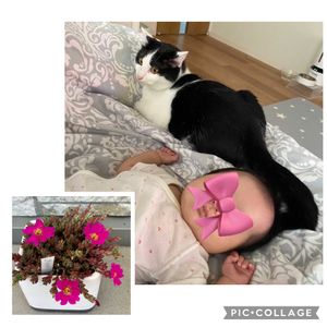 1日遅れのニャンニャン祭り🎉 2枚目🙇 娘夫婦の猫 ハチ&孫娘🎀 ハチはまだ一歳になったばかりで 赤ちゃんは初めて ハチはいつもそばに居て 何だか守ってるみたい🛡️ 娘に言うと 匂いが好きなだけじゃないって🤣 カイくんは 11歳で子供が苦手 なので赤ちゃんのそばにも 行かないらしいです 2枚目 まんまるお目目の カイくん 3枚目 4枚目 まだ子猫っぽいハチ坊👶 ↙️酷暑でも元気なピンキー お花咲きました🌸
