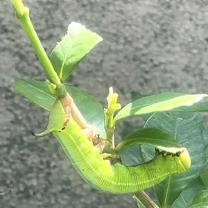 【季節の光景:🐛オオスカシバ幼虫のご馳走クチナシ】 🐛日曜日の昼下がり、ベランダで植栽養生中のクチナシの🍃新芽の若葉をムシャムシャ食べているオオスカシバ;大透翅の幼虫2匹が昼食中でした。 これで3匹が、三鉢あるうちの一鉢は半分以上のクチナシの🍃若葉を食い荒らしていることになります🐶 そのままにしていたら食い荒らされて丸裸にされると思いながら、可哀想ではありますが、この撮影の後に🐛虫駆除しましたデスら🐱 ✍️Works:Poetaster Kazyan Doe.,//筍歌人;藪中和堂 《訂正》アゲハ蝶❌は間違いで、オオスカシバ⭕️とのご指摘を頂き、調べ直したところ改訂しました🙏 先にご覧頂いた皆さまにはこの場を借りてお詫び申し上げます🙇‍♂️ 📖オオスカシバ:豆知識  オオスカシバの幼虫は、クチナシの葉を食べることで知られる、毛のないイモムシ型の幼虫です。 緑色または茶色の個体が存在し、食痕やフンで存在が確認できます。 成虫は透明な翅を持つ美しい蛾で、昼間に花の蜜を吸う姿が見られます。 📝オオスカシバの幼虫の特徴: 外見:毛のないイモムシ型で、緑色または茶色の個体がいる。体長は約6cm、太さ1cmほど。 食性:クチナシの葉を好んで食べる。 行動:活発に動き回り、葉を食べる。 毒性:毒はなく、人を刺すこともない。 その他:尾に角のような突起(尾角)を持つ。 飼育:食草と一緒に飼育ケースに入れると観察しやすい. 📝オオスカシバの成虫の特徴: 外見:透明な翅と紡錘形の胴体を持つ。 まるでジェット戦闘機のよう 神戸教育情報ネットワークによると。 行動:昼行性で、花の蜜を吸うために飛翔する。 昆虫写真図鑑 ムシミルによると。 その他:翅には微細な顆粒が密生し、透明度を高めている。 📝その他: オオスカシバの幼虫は、クチナシを植えている場所で見つけやすい。 幼虫は、葉をたくさん食べるため、クチナシの葉が丸坊主になることもある。 成虫は、ハチと間違われることがあるが、人を刺すことはない。 Artistic;Pellucid hawk moth June 29,2025:past 15:00’;📱shooting June 29,2025:past 15:45';upload by Kazyan’s Green Studio