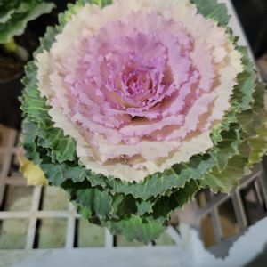 おはようございます👋😃 花友さんに頂いた葉牡丹で作る寄せ植え。3つ目は、3年目の葉牡丹(一昨年のリングバスケットの苗を解体)の下に、今年の葉牡丹を植えました。茎は紫と白。太くて一応クネクネさせてます😁高さは85cmスノコフェンスから顔出してます。1m弱。 今年は早目に肥料を絶ち、寒い北側玄関に置いたのだけど・・・。踊りキャベツのような緑のまま😂去年のpicを確認したら、12月は緑。2月になってやっと紫になってました😣 踊り葉牡丹の切り戻しを教えて頂いたので、来年は花が咲き終えたら早めにカット✂️して、わき芽を伸ばすように頑張ります💪。 お正月風のピックは撮影用🤭今はまだクリスマスのピック刺してます。 (2022/12/13撮影 記録用)