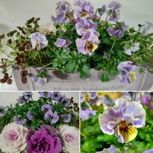 11/26 に 寄せ植え🌸 ビオラ4苗、葉牡丹、チューリップ🌷2個、 昨年からのアイビー🍀はそのまま使い、12/14 パンジー・フリンジ💜を追加😃 12/17 に撮ったpicです(๑˃̵ᴗ˂̵)📱