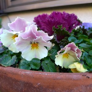 種からハボタン&玄関前の寄せ植え 5枚投稿です♪ ①葉牡丹を初めて種から育てています プラチナケールF 1ルーシーミックス 9月に種まきでは遅いと思いましたがなんとかここまで成長しました まだ大鉢に植えているのでこれからどうしようか思案中🤔 ②種から葉牡丹を入れた寄せ植え *ビオラ ピエナ イエロージャンプアップ *ツルニチニチソウ (庭から引っこ抜いて) ③昨年の葉牡丹プラチナケール 昨年お迎えしたワイヤープランツ スポットライトと寄せ植えに ④他の寄せ植えと全体的に🤳 ⑤ビオラを入れた寄せ植え *ソルベ イエローブルージャンプアップ *斑入りツルニチニチソウ ワジョージェムと一緒に (今まではおひとり様) おはようございます😃 暖かくして良い1日をお過ごしください🌸 🏷️色々参加させてください