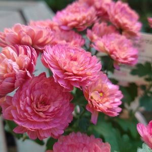 ジジガーデンマム🌸 寒い冬も暑い夏も乗り切り たくさんの蕾がついてくれました♡ やっと咲きはじめ鮮やかなピンク色 可愛すぎて🥰