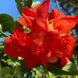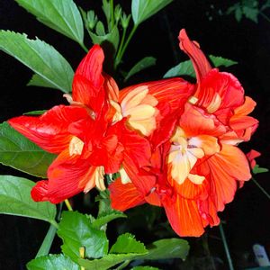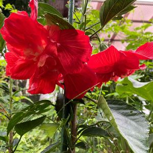 Hibiscus Madam Pele この品種は変わり咲きで 色々なタイプのお花が楽しめるのだけど 今は朱色 一重 約12cm のお花が毎日咲いてます🌺 長年育ててますが 3輪同時開花は 初めてで 感動したので アップしちゃいました❣️💕💕