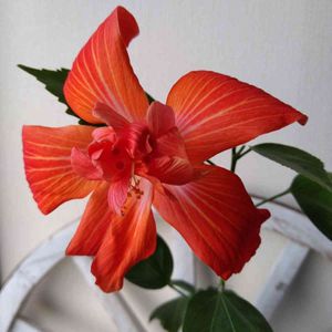 hibiscus Madam Pele 変わり咲き品種 順調に花弁が増えていくかと思いきや 今日のお花は また 一重に逆戻り😳 以前の一重の花とは少し色が薄く 朱色っぽくなってます🌺 金色の筋も心なしかはっきり見える気がします💕 そして 今日は 2輪開花してくれました❣️