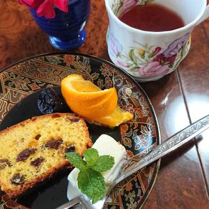 ラム酒のケーキ、焼きました🎵 🍊、plum、🍨~お庭のペパーミント、紅茶と共に~。♪.:*:・'°❣️ 🌹ニチニチソウを添えて どうぞ、お召し上がり下さい~🍰☕🍃