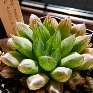 ハオルチア日光浴中🌞 サリナたち 成長ゆっくりですが、大きくなってます😊 光に当たるときれいです✨ 3枚目はディンセ玉で入手しましたが、南蛮玉かな?? わかる方いたら教えていただきたいです🙏 薄紫に見えて綺麗だったのでお迎えした子です ようやくシワがとれたと思ったら、パックリお口を開けたみたいになってきた😳 ニヤけてるようにも見えてこわ😅