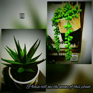 皆様、こんばんは✋ この間のトイレの植物レイアウト変更を考え 足らない部分にニューフェイス 多肉二種 ホームセンターより購入しました。(また買ってしまった)。 十二の巻のようなカッコィー奴と、グリーンネックレスみたい可愛いい奴です。 ただ、名前の表示がなくて困っております。 どうか、多肉にお詳しい皆様 この二種の名前 教えて下さい。
