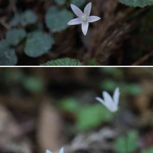 タニギキョウです。ニワゼキショウの半分もないような大きさで、ラッパ🎺の形をしてます。背丈も数センチと低いため、薄暗い森の中で白い点々のように見えます。 富士山麓にて