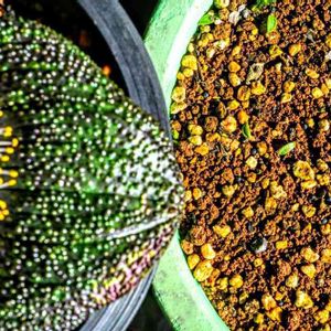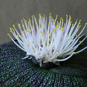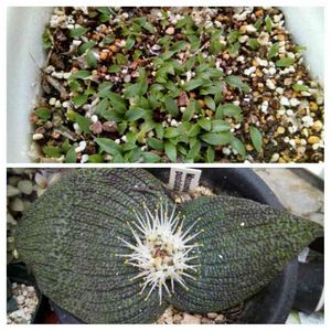 南アフリカ原産の魅力的な球根。 粒々の多肉質の葉っぱに、不思議な花🍀 マッソニア・プスツラータ Massoia pustulata 少し前までは、すべて「ロンギペス」の名称で流通していましたが現在は別種扱いなのか、シノニムなのか?? 二株あるので、上は昨年交配して種を採り、8月下旬蒔いたもののベビーちゃん。✨これは明らかに混みすぎですね💦植え替えよう… 球根植物の実生は、種から小さな球根が出来ていく様を観察するのが、楽しいですね😄