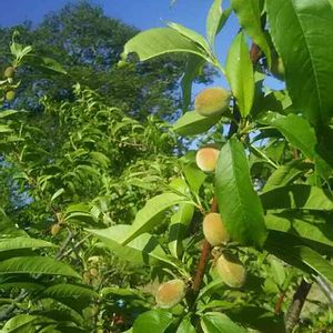 桃の摘果作業。 毛虫を見つけて半泣き。