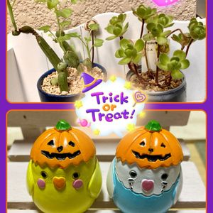 こんばんは✨✨ 🏷️毎月15日はインコの日 seriaで可愛いインコちゃん🎃をみつけました💕 左は七宝樹☘️ 最近葉っぱが出てきました🌱 成長期かな? 右のアエオニウムのアドニスもお目覚めです(*^▽^*)