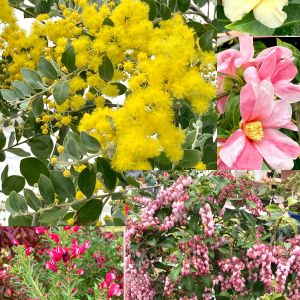 こんばんは お出掛けのお花の続きです ↖️ミモザ ポダリーフォリア (パールアカシア) ↗️椿 初黄 ↘️赤花アセビ ↙️羽衣の木 グレビレア ピグミーダンサー 700円買いました 今日3回目の投稿も見ていただきまして、ありがとうございました