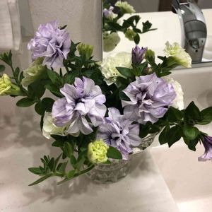 💜サフィニアフリル💜 そろそろ株が疲れて来たようなので、冬越しに備えて全て切りました。 まだ綺麗な分は洗面所に飾りました😊 うーん、可愛い💕