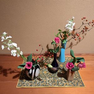 サンキライでそれぞれの花器のつながりが出せるように、意識して配置しました。 また、それぞれの花器で同じ花材ばかりにならないように気をつけました。 今回の花材はどれも可愛らしくて、いけているだけでワクワクしました✨