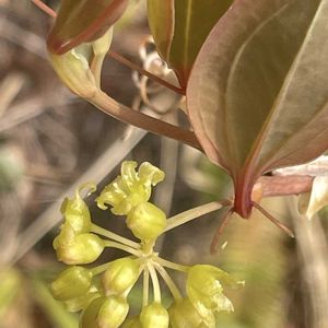 今日のお花 🌱 サルトリイバラ🌱 サルトリイバラ科 シオデ属 落葉つる性 雌雄異株 ❶花 2025年4月17日 ❷青い実 〃 6月 1日 ❸❹赤い実 〃 11月27日 ❺紅葉 〃 1月 2日 ❶雄花 小花が集まって半球、基本雄蕊は6本、花びらは光沢があります。 雌花はまだ見たことありません。 雄花よりも小さいそうです。 小花が集まり球体、雌しべの先、柱頭は3裂。花の下がふっくらした子房があります。 赤い実が生るのは雌株。 里山散策にて。