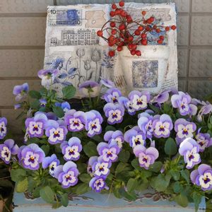 12月中旬🌞 あっという間に師走半ば、早いなあ。 本の形プランターが見えなくなる位ビオラがモリモリ。 先生作のクールなモルタルブックには小さな鉢が付いています。デコパージュの鳥さんにリースの余りの赤い実サンキライをプレゼント🔴
