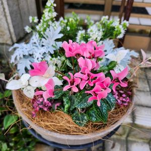 今日はお天気も良く涼しかったので 植え込みや寄せ植えを作ってみました😊 腰痛確定デス😅 1⃣早くもクリスマス仕様🎅 2️⃣ピンクのシクラメン寄せ植え🩷 3️⃣大好きホイップミルク🤍 4️⃣ピンクのガーベラちゃん🩷