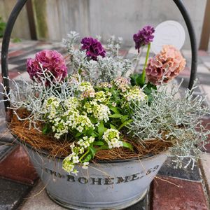 今期は中々黒いお花に出会えず ホムセンで弱々になってた黒パンジーを 見つけてお迎えしてみました🖤 元気になってくれるといいなぁ~😊 お気に入りのブリキに アリッサムとシルバーレースを 添えて…というか支えてもらいました😅