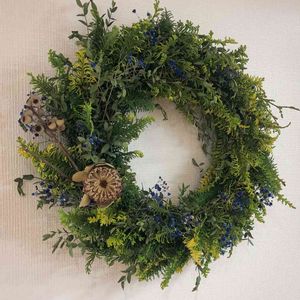 オフィス用にもうひとつリースを作りました🥰 こちらは、ヒバをメインに小さい葉っぱのユーカリや、家にあったブルーのカスミソウなどドライを合わせました🌲 創作欲が満たされ満足です☺️