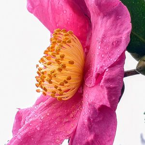 雨の贈り物☔🎁 水滴の水曜日 水滴の中に 『サザンカ』が咲いてます🌼*・ お庭の山茶花も 今季 ✨千秋楽✨です🍀 🫒🌿🌿21