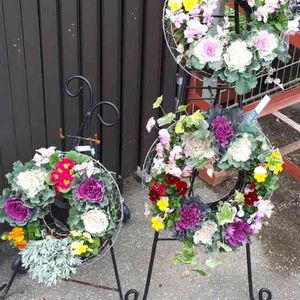 こんにちは〜 葉牡丹&ビオラ リース作りました❣️ 和風のお庭でも結構イケる😆 ミニ葉牡丹買うタイミング逃して 諦めていた所 半額になっている小さめの葉牡丹発見❣️ ビオラも1ポット60円❣️ 苗代 総額600円弱に❤️ 今年はお値打ちリースで我慢〜 来年は早く買いに行こうと、反省です😅