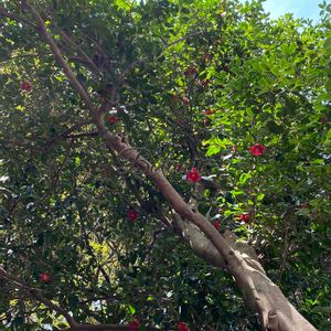 見上げてごらん〜♬ 産土神社にお参りに行きました。 手を合わせながら御神木のクスノキの幹を見ていたら、 若い細い新枝が一本生えてた。 そのまま目線を空に向けると… 椿でしょうか? 空高く沢山のお花が咲いていました。 *✲゚*( *´﹀` )*✲゚*