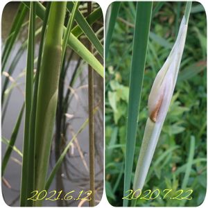 昔から若葉は食用 花粉は蒲黄と言って傷薬として使われてたりその他 蚊取り線香布団の綿にも使われたりとても役に立っている植物なんですね! 花材にもオシャレな演出が出来る優れもの⁉️ 昨年どんなふうに誕生するのか寸前を見たくて観察しましたが気付いた時はもう穂がほんの少し出てしまっていました。 今年こそはと注意深く観察しようと意気込んでいました。 今年は植物全般開花が早くガマはどんなかしらと思っていましたら あるところではもうすっかり穂が出ていましたのでびっくり🌀一月以上早かったようです。 左が一昨日見た別の場所の様子。もう一息で咲く姿。 これが見たかったのですが皆さんには伝わりにくそうなので昨年の様子と合わせてみました。( ◠‿◠ )