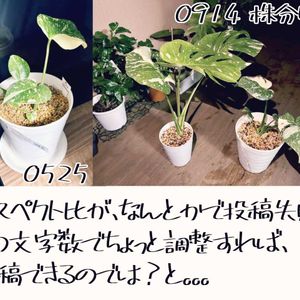 モンモン三兄弟ようやく全開かな? 後は緑濃くなーれ♡ ✤綺麗な3号から 1.2全体と開いた葉。 白多めだけどちゃんと白いだけで今は嬉しい(>∀<) ✤2号 3.4同じく全体と開いた葉 前回の上に見える葉は、ほぼ緑で不安だったけど、ちゃんと斑入りなった♪ 左右で順番なら次はどーかな!笑 ✤1号 ラスト。これはパカーンと開かないらしい 真ん中カックンのまま。 まだミニミニだけど、土に植え替えちゃった。 しかし3ヶ月水苔管理、元々の気根は元気だったけど発根してなかったのよね、様子見😆