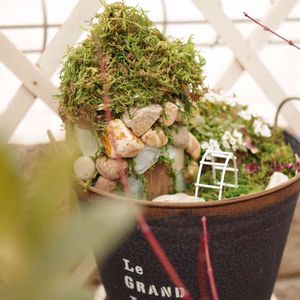 自作の妖精さんと、シンボルツリーのシマトネリコを剪定した枝で作った手作りミニチュアハウスをバックに🌸ローダンセマムのプチマカロン♡