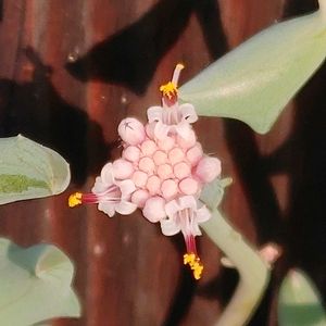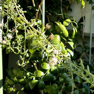 真冬ながら、多肉のドルフィンネックレスの 花が初めて咲きました。 蕾が出来てから結構開花までかかりました。 小さい可愛い鉢に植えていたのですが、異常に伸びて根に負担かと切って直接水に入れています。 多肉植物ってさほど水要らないのでしょうが、元気に開花させました。