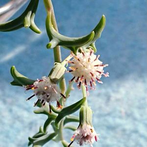 花が咲いたよ 🍂 ドルフィンネックレス セネシオ属 初めて👀見た。白い変わった花ですよ オシベがクルンと丸まってるね まだまだ時期早すぎだと思うのだが? 七宝樹とグリーンネックレスを交配させた種らしい 葉っぱのイルカ🐬が跳ねてる💦