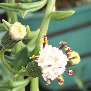 ドルフィンネックレス 正式名称 セネシオ・ペレグリヌス キク科 セネシオ属 イルカ🐬が跳ねているような可愛い葉のドルフィンネックレスは垂れ下がって茎を伸ばして成長していきます。 ←蕾が出来てくると垂れ下がった茎をグイっと上向きにして花を咲かせます。 ↗pic花はキク科らしい小さな筒状花(管状花)の集まりで外側から咲きはじめます。 →先に雄蕊が熟して花粉を出します。 ↘後から雌蕊を伸ばして受粉します。(雄性先熟) クリンクリンの雌蕊がなんとも可愛らしいですネ~🎶