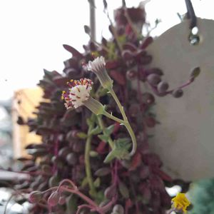 🍂ドルフィンネックレス セネシオ属 銀月と同じ属なんだね。 そうそう、花が咲いたよ! 小さくて白い花 花よりオシベが目立ってるね。