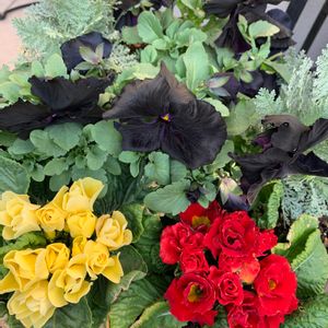 わわわーっ‼️‼️‼️😅 3連投だー😆ブラックパンジーさんたちがもりもりしてきたので、なんだかド派手な寄せ植えになってます✌️😅✨ クリームパンジュリアンさんと真っ赤なジュリアンさんと並んで、玄関前で目立ってます😅😅😅