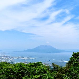錦江湾を一望する-Ⅱ 正面は桜島🌋 近すぎてカメラでは撮れず、携帯の広角で撮りました🤳 空も山も海も青い💙