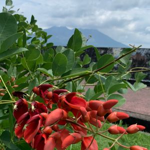 こんにちは😊 桜島🌋をバックに赤い花🌸🤗