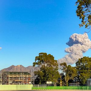 散歩の途中 昼間の月を見上げていると 桜島が噴煙をあげる 桜島の姿が見える小学校の校庭越しに 2023.1.3