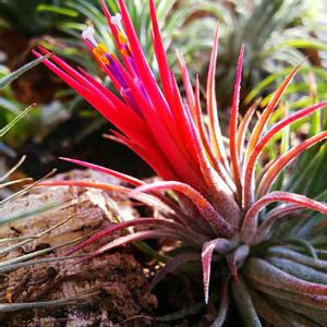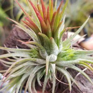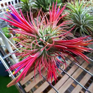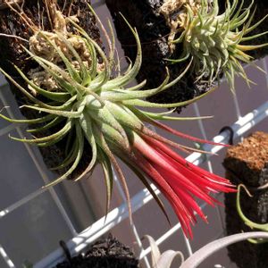 チランジア イオナンタ フエゴ イオナンタフエゴのクランプのうちの一株が開花し始めました😊 陽当たりいまいちですが、開花株は綺麗に赤く染まってくれてます😁