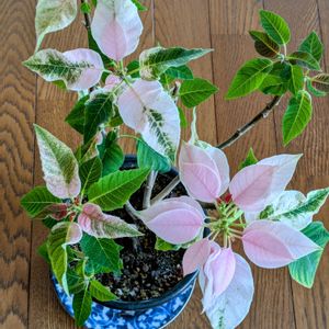 おはようございます。◕‿◕。 昨年11月に買ったプリンセチア、冬越しし、窓辺で元気に咲いています。 一回り小さくなったけれど…、