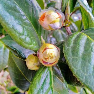 匂い椿の匂いを嗅ぎ忘れたので行ってきました。 開花した匂い椿は高い所にあって嗅げませんでした。😭 側にあった椿黄河がもうじき咲きそうです。