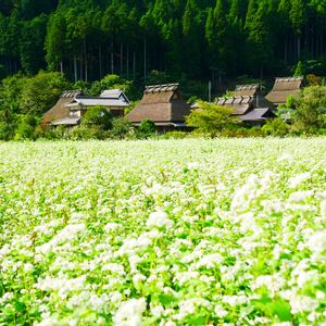 《美山かやぶきの里》 蕎麦の花が一面に広がっています