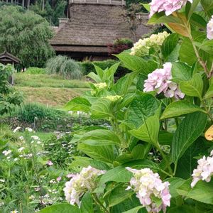 京都 美山かやぶきの里。 紫陽花と同じ色の、ニンニクの花。仲良く並んで咲いてました~💕 みどりのまとめの1枚。 (2023/6/25)