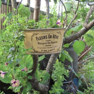 大好きブリキ鉢ෆ˚* 劣化は早いけど買ってしまうꕀ⋆ 今年ネットショッピングした小さめブリキ鉢♪̊̈♪̆̈ 挿し芽ッコを入れてあります🌿,, スモークツリーにぶら下げて❶❷ 植えた時にあげる万田酵素のシャワーが もったいなくて オベリスクにぶら下げて (漏れ出た水が下の植物にかかるように) なんとなくそのままに( ˆmˆ )❸ この辺に伸びてるツルハナナス❹可愛いのෆ˚* もう少し花つけてほしい 昨日の📸 やっと花が見れた!!リトルボーイは 薄い色ꕀ⋆❺ 薄色なので蛇口のオブジェに重なって 見えにくいですね.°ஐ.* 今日の📱✨️